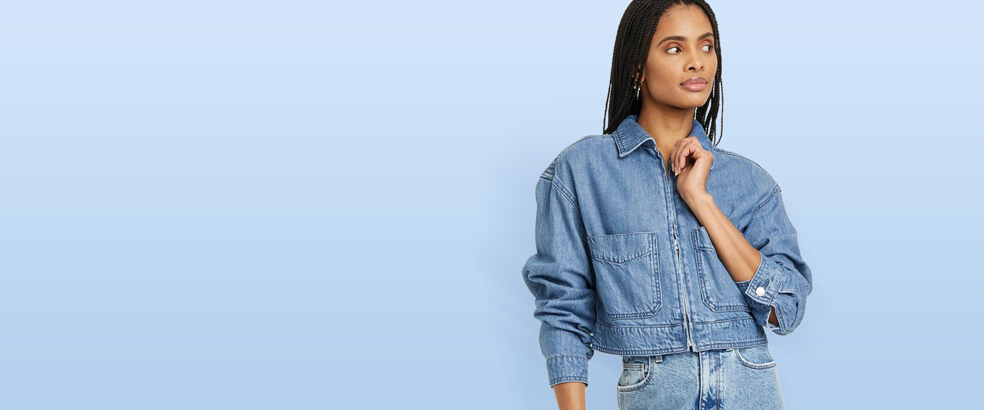 The medium-wash denim jacket is made of midweight cotton-rich fabric for comfortable all-day wear.